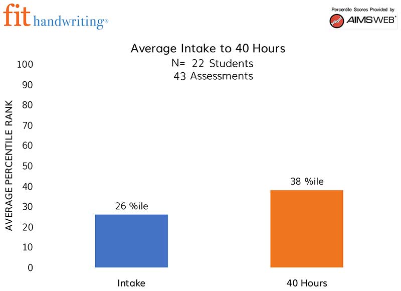 The graph includes all learners from 2018 to the present who completed 40 hours of Fit Handwriting. On average, learners gain 12 percentile points across various measures of handwriting.