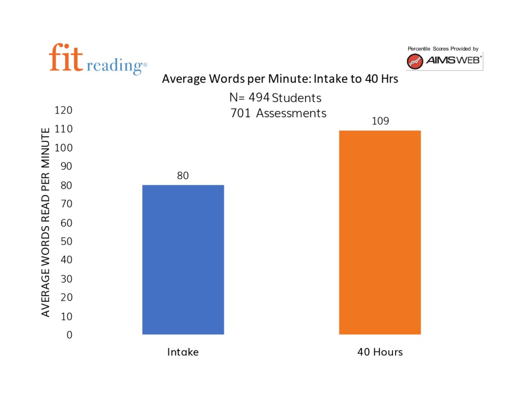The graph above includes all learners from 2018 to the present who completed 40 hours of Fit Reading. On average, learners gain 26 percentile points across a variety of reading measures.